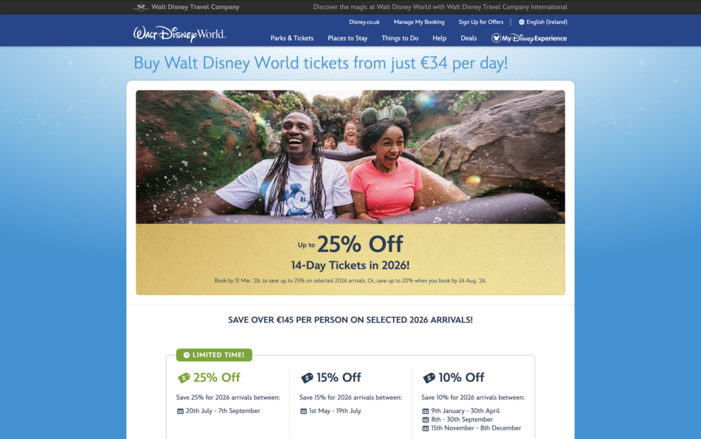 Actuellement, sur le premier trimestre 2026, Walt Disney World propose des billets 14j jusqu’à -25% pour vos séjours 2026 :