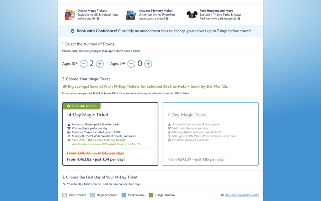Les billets 14j sont exclusivement proposés sur le site UK / irlandais de Walt Disney World. Vous pouvez les acheter dans un package avec hôtel ou seuls.